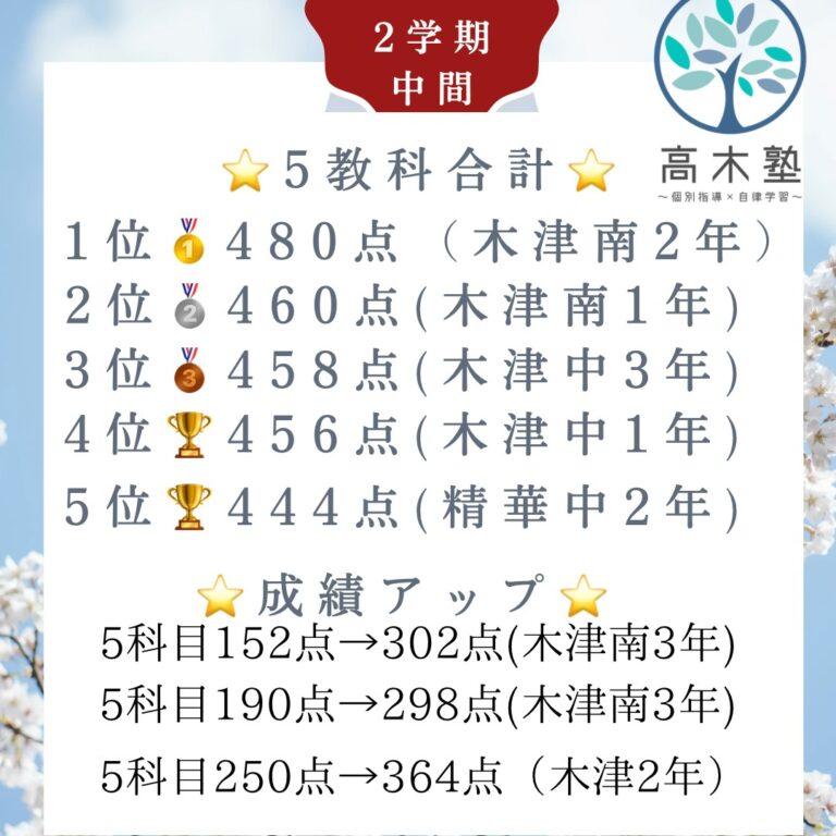 みなさんこんにちは!高木塾の高木です。 本日は嬉しいことがありましたのでご報告させて頂きます! 州見台に中学1年生の終わりから在籍いただいている、Yくんがテスト […] -