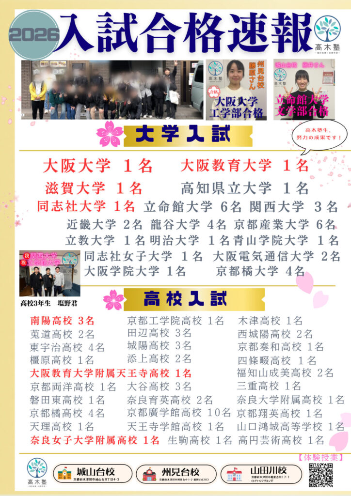 いつも高木塾をご支援いただきありがとうございます。2026年の入試シーズンが終わり、塾生たちの合格の報せが次々と届いています。今年も大学入試・高校入試の両方で素晴らしい結果となりました。木津川市をはじめ、近隣にお住まいの保護者様にぜひご覧いただきたい実績をまとめてご報告いたします。